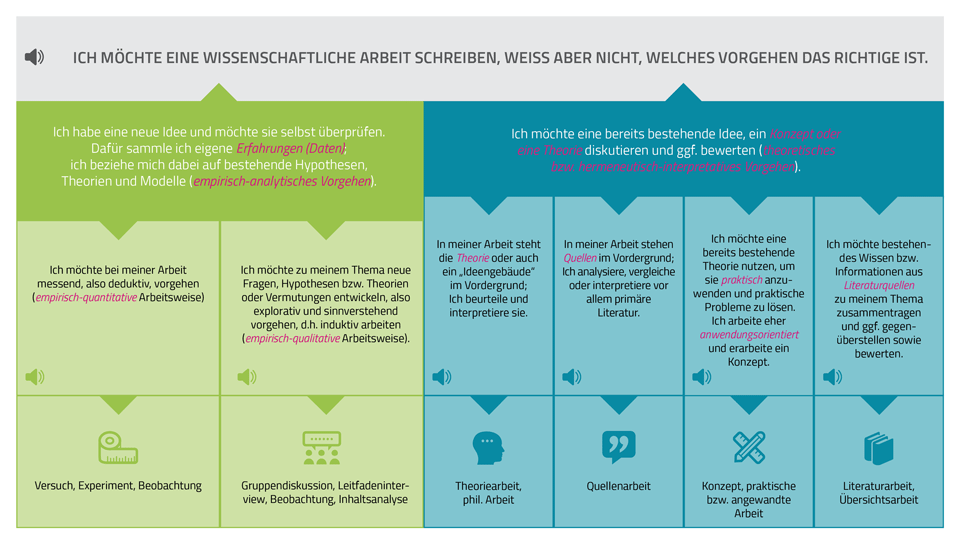 ![]() | Welche wissenschaftliche Vorgehensweise ist sinnvoll? Oder: Welcher Typ von wissenschaftlicher Arbeit passt zum Thema? |